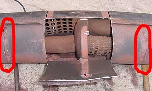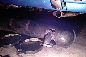 - 外したマフラーは上側も帯状に錆び穴が破けて5カ所も穴があいていました。